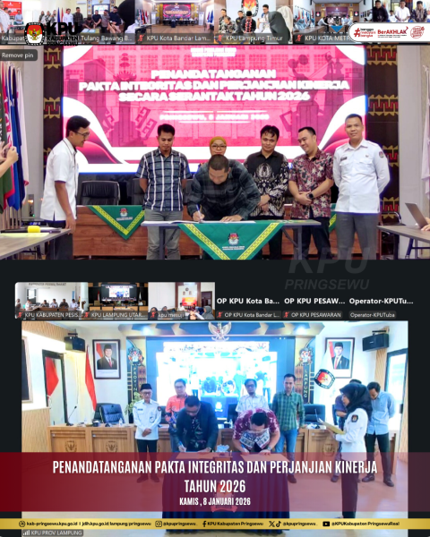 Tabik Puuun #TemanPemilih, Komisi Pemilihan Umum (KPU) Provinsi Lampung menyelenggarakan kegiatan Penandatanganan Pakta Integritas dan Perjanjian Kinerja secara serentak Tahun 2026 sebagai wujud komitmen bersama dalam mewujudkan tata kelola kelembagaan yang berintegritas, profesional, dan akuntabel. Kegiatan ini diikuti oleh Ketua, Anggota KPU Provinsi Lampung, pejabat struktural, serta seluruh jajaran sekretariat sesuai dengan ketentuan yang berlaku. Penandatanganan Pakta Integritas merupakan pernyataan sikap dan komitmen moral seluruh unsur pimpinan dan aparatur KPU Provinsi Lampung untuk senantiasa menjunjung tinggi nilai kejujuran, tanggung jawab, transparansi, serta kepatuhan terhadap peraturan perundang-undangan dalam setiap pelaksanaan tugas dan kewenangan. Sementara itu, Perjanjian Kinerja Tahun 2026 menjadi instrumen penting dalam perencanaan, pelaksanaan, dan evaluasi kinerja, yang memuat target, indikator, serta sasaran strategis yang harus dicapai secara terukur dan berkelanjutan. Melalui kegiatan ini, diharapkan seluruh jajaran KPU Provinsi Lampung memiliki kesamaan persepsi dan komitmen yang kuat dalam meningkatkan kinerja organisasi, memperkuat sistem akuntabilitas kinerja instansi pemerintah (SAKIP), serta mendukung terwujudnya penyelenggaraan pemilihan yang berintegritas dan berkualitas. Penandatanganan ini juga menjadi langkah awal dalam memastikan setiap program dan kegiatan Tahun 2026 dilaksanakan secara efektif, efisien, dan tepat sasaran. KPU Provinsi Lampung berkomitmen untuk terus meningkatkan kualitas pelayanan publik, pengelolaan anggaran, serta pelaksanaan tugas kelembagaan secara profesional dan bertanggung jawab. Dengan adanya Pakta Integritas dan Perjanjian Kinerja ini, diharapkan terbangun budaya kerja yang berorientasi pada hasil, menjunjung tinggi nilai integritas, serta memberikan kontribusi nyata bagi penguatan demokrasi di Provinsi Lampung. @kpu_ri @kpu_lampung #KPUMelayani #KPUPringsewu #ASNBerAKHLAK ....