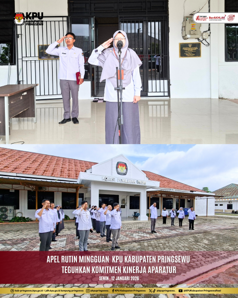 Tabik Puuun #TemanPemilih, Sekretariat Komisi Pemilihan Umum (KPU) Kabupaten Pringsewu melaksanakan apel rutin mingguan pada Senin, 12 Januari 2026, bertempat di lingkungan Sekretariat KPU Kabupaten Pringsewu. Kegiatan ini merupakan agenda kedinasan yang dilaksanakan secara berkesinambungan sebagai upaya meneguhkan komitmen kinerja aparatur serta memperkuat kedisiplinan, tanggung jawab, dan profesionalisme seluruh jajaran sekretariat. Apel rutin mingguan tersebut diikuti oleh para pejabat struktural, fungsional, serta seluruh pegawai di lingkungan Sekretariat KPU Kabupaten Pringsewu. Dalam kesempatan ini, bertindak sebagai pembina apel adalah Kepala Subbagian Keuangan, Umum, dan Logistik KPU Kabupaten Pringsewu, Ibu Atek Lis Indriyani. Dalam amanatnya, pembina apel menekankan pentingnya menjaga integritas, meningkatkan etos kerja, serta melaksanakan setiap tugas dan fungsi secara tertib, akuntabel, dan sesuai dengan ketentuan yang berlaku. Lebih lanjut, apel rutin mingguan juga menjadi sarana penyampaian informasi kedinasan, evaluasi pelaksanaan tugas, serta penguatan koordinasi internal antarbagian di lingkungan sekretariat. Melalui kegiatan ini, diharapkan seluruh aparatur KPU Kabupaten Pringsewu dapat menyelaraskan langkah dan komitmen dalam mendukung kelancaran pelaksanaan tugas kelembagaan. Pelaksanaan apel rutin mingguan mencerminkan komitmen KPU Kabupaten Pringsewu dalam membangun budaya kerja yang disiplin, profesional, dan berorientasi pada pelayanan publik. Dengan semangat kebersamaan dan tanggung jawab, seluruh jajaran sekretariat diharapkan mampu terus meningkatkan kualitas kinerja guna mendukung terwujudnya penyelenggaraan pemilu dan pemilihan yang berintegritas, transparan, dan demokratis di Kabupaten Pringsewu. @kpu_ri @kpu_lampung #KPUMelayani #KPUPringsewu #ASNBerAKHLAK ....