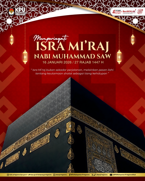 Tabik Puuun #TemanPemilih, Segenap Keluarga Besar KPU Kabupaten Pringsewu Mengucapkan Selamat memperingati Isra Miraj Nabi Muhammad SAW 1447 H. Semoga kita senantiasa mendapatkan hidayah dan keberkahan dari peristiwa agung ini. Mari jadikan perjalanan suci ini sebagai inspirasi untuk meningkatkan keimanan dan ketaqwaan kita kepada Allah SWT. @kpu_ri @kpu_lampung #KPUMelayani #KPUPringsewu #ASNBerAKHLAK ....