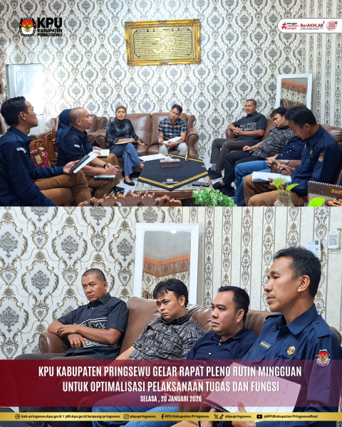 Tabik Puuun #TemanPemilih, Komisi Pemilihan Umum (KPU) Kabupaten Pringsewu melaksanakan Rapat Pleno Rutin Mingguan pada Selasa, 20 Januari 2026, bertempat di lingkungan Sekretariat KPU Kabupaten Pringsewu. Kegiatan ini dipimpin langsung oleh Ketua KPU Kabupaten Pringsewu dan diikuti oleh seluruh Anggota KPU Kabupaten Pringsewu serta para Kepala Subbagian (Kasubbag) di lingkungan Sekretariat KPU Kabupaten Pringsewu. Rapat pleno rutin mingguan merupakan agenda kelembagaan yang bertujuan untuk menjaga kesinambungan koordinasi, komunikasi, dan konsolidasi internal dalam rangka mengoptimalkan pelaksanaan tugas dan fungsi KPU Kabupaten Pringsewu. Melalui forum ini, pimpinan dan jajaran sekretariat secara bersama-sama melakukan evaluasi terhadap pelaksanaan kegiatan yang telah berjalan, sekaligus membahas rencana kerja dan tindak lanjut program ke depan. Ketua KPU Kabupaten Pringsewu dalam arahannya menekankan pentingnya sinergi antara unsur pimpinan dan sekretariat guna mewujudkan kinerja organisasi yang efektif, akuntabel, dan profesional. Selain itu, rapat ini juga menjadi sarana untuk menyamakan persepsi, memperkuat komitmen bersama, serta memastikan seluruh pelaksanaan tugas berjalan sesuai dengan ketentuan peraturan perundang-undangan yang berlaku. Dengan dilaksanakannya rapat pleno rutin mingguan secara konsisten, KPU Kabupaten Pringsewu berkomitmen untuk terus meningkatkan kualitas tata kelola kelembagaan, memperkuat koordinasi internal, serta mendukung tercapainya penyelenggaraan pemilu yang berintegritas dan berkualitas. Kegiatan ini diharapkan mampu menjadi pondasi yang kuat dalam menjaga profesionalisme dan soliditas seluruh jajaran KPU Kabupaten Pringsewu. @kpu_ri @kpu_lampung #KPUMelayani #KPUPringsewu #ASNBerAKHLAK ....