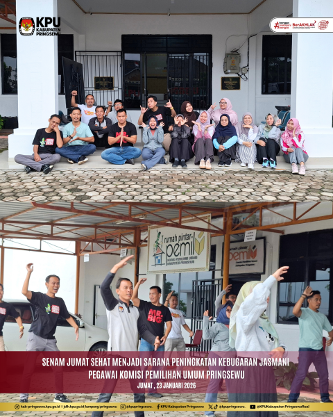 Tabik Puuun #TemanPemilih, Sekretariat KPU Kabupaten Pringsewu melaksanakan kegiatan Senam Jumat Sehat pada Jumat, 23 Desember 2026, bertempat di lingkungan Sekretariat KPU Kabupaten Pringsewu. Kegiatan ini merupakan bagian dari agenda rutin yang dilaksanakan sebagai upaya menjaga kebugaran jasmani serta meningkatkan disiplin dan produktivitas pegawai dalam menjalankan tugas dan fungsi kelembagaan. Senam Jumat Sehat diikuti oleh seluruh pegawai sekretariat dengan penuh antusias. Rangkaian kegiatan diawali dengan pemanasan, dilanjutkan dengan gerakan inti yang dipandu oleh instruktur, serta ditutup dengan pendinginan. Aktivitas fisik ini dilaksanakan secara bersama-sama dalam suasana tertib dan kondusif, mencerminkan semangat kebersamaan dan kekompakan di lingkungan kerja. Pelaksanaan kegiatan ini diharapkan dapat memberikan manfaat positif bagi kesehatan fisik dan mental pegawai, sehingga mampu menunjang kinerja serta meningkatkan semangat kerja. Dengan kondisi tubuh yang sehat dan bugar, pegawai diharapkan dapat melaksanakan tugas pelayanan publik secara optimal, profesional, dan berkelanjutan. Melalui kegiatan Senam Jumat Sehat, KPU Kabupaten Pringsewu terus mendorong penerapan pola hidup sehat di lingkungan kerja serta membangun budaya organisasi yang disiplin, produktif, dan berorientasi pada peningkatan kualitas kinerja. Kegiatan ini juga menjadi salah satu sarana untuk mempererat koordinasi dan kebersamaan antarpegawai, sekaligus menciptakan suasana kerja yang harmonis dan positif di lingkungan Sekretariat KPU Kabupaten Pringsewu. @kpu_ri @kpu_lampung #KPUMelayani #KPUPringsewu #ASNBerAKHLAK ....