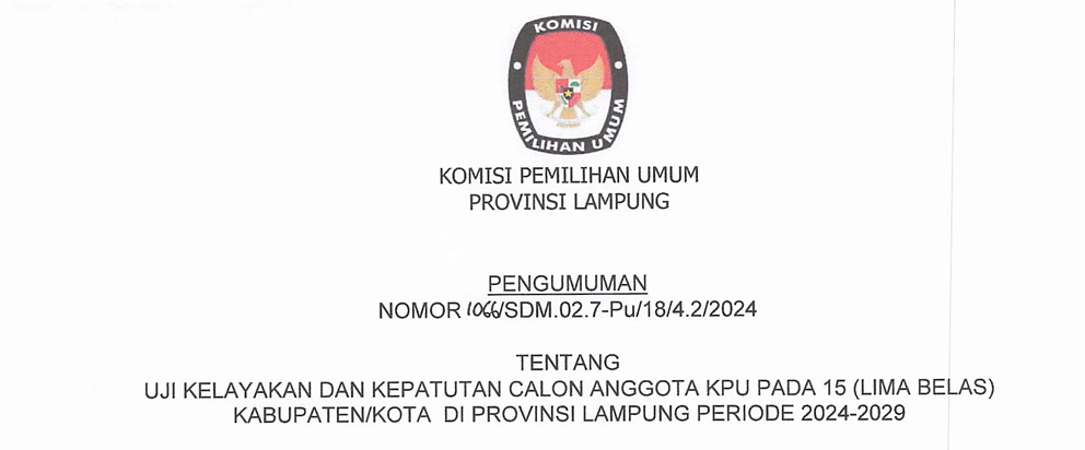 PENGUMUMAN NOMOR 1066/SDM.02.7-Pu/18/4.2/2024 TENTANG UJI KELAYAKAN DAN KEPATUTAN CALON ANGGOTA KPU PADA 15 (LIMA BELAS) KABUPATEN/KOTA DI PROVINSI LAMPUNG PERIODE 2024-2029