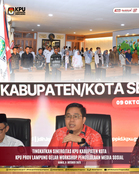 Kamis, 9 Oktober 2025, Komisi Pemilihan Umum (KPU) Provinsi Lampung menyelenggarakan Workshop Peningkatan Media Sosial dalam Rangka Keterbukaan Informasi Publik bagi KPU Kabupaten/Kota se-Provinsi Lampung. Kegiatan ini dibuka secara resmi oleh Ketua KPU Provinsi Lampung dan dihadiri oleh Ketua Divisi, Kepala Subbagian SDM dan Parmas, serta operator media sosial dari masing-masing KPU Kabupaten/Kota.
