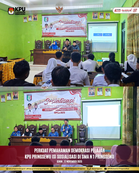 KPU Kabupaten Pringsewu kembali hadir untuk memberikan edukasi politik kepada generasi muda sebagai upaya meningkatkan kualitas partisipasi masyarakat dalam pemilu. Pada Senin, 17 November 2025, Badan Kesatuan Bangsa dan Politik (Kesbangpol) Kabupaten Pringsewu menyelenggarakan Sosialisasi Pendidikan Politik bagi Pemilih Pemula di SMA Negeri 1 Pringsewu, menghadirkan KPU Pringsewu sebagai narasumber utama.