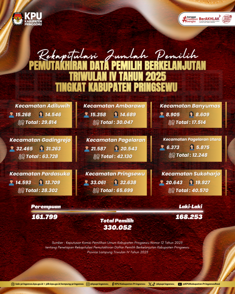 Berikut Kami Sampaikan hasil Rekapitulasi Pemutakhiran Data Pemilih Berkelanjutan (PDPB) Triwulan IV Tahun 2025 Komisi Pemilihan Umum Kabupaten Pringsewu.