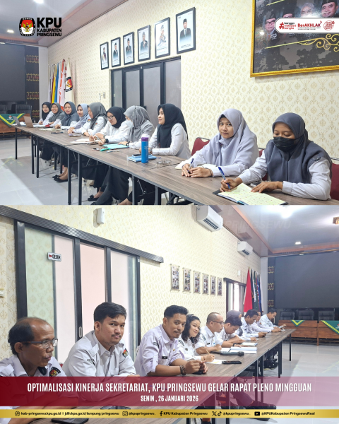 Komisi Pemilihan Umum (KPU) Kabupaten Pringsewu kembali melaksanakan Rapat Pleno Rutin Mingguan yang berlangsung di lingkungan Sekretariat KPU Kabupaten Pringsewu pada Selasa, 26 Januari 2026. Kegiatan ini dipimpin langsung oleh Ketua KPU Kabupaten Pringsewu, Dewi Eliyasari, serta diikuti oleh Anggota KPU, Sekretaris KPU Kabupaten Pringsewu, para Kepala Subbagian, dan seluruh staf sekretariat.