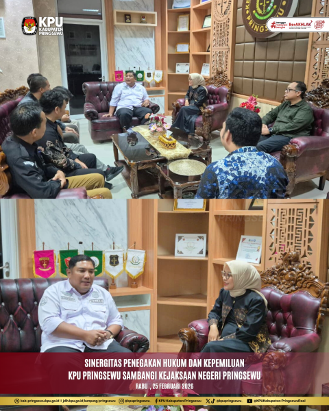 Rabu, 25 Februari 2026, Komisi Pemilihan Umum Kabupaten Pringsewu melaksanakan audiensi dan koordinasi kelembagaan bersama Kejaksaan Negeri Pringsewu sebagai bagian dari upaya memperkuat sinergitas penegakan hukum dan penyelenggaraan kepemiluan. Kegiatan ini menjadi momentum strategis dalam membangun komunikasi yang konstruktif, kolaboratif, dan berkelanjutan antar lembaga.