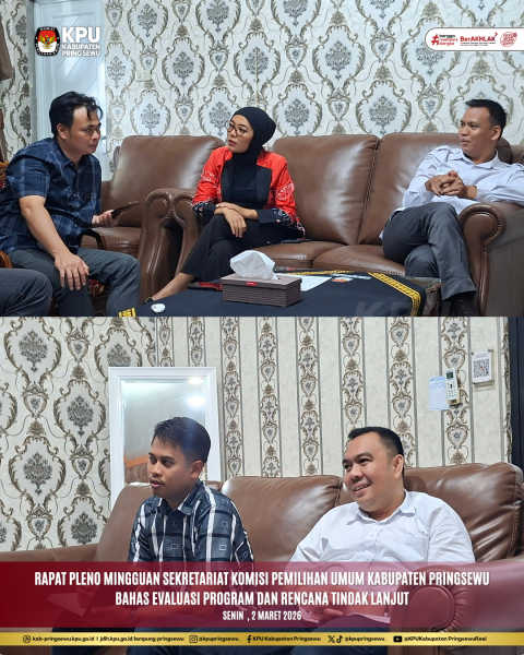 Komisi Pemilihan Umum Kabupaten Pringsewu melaksanakan Rapat Pleno Rutin Mingguan pada Senin, 2 Maret 2026, sebagai bagian dari komitmen penguatan koordinasi dan konsolidasi internal kelembagaan. Kegiatan ini menjadi forum strategis dalam rangka evaluasi pelaksanaan program kerja, monitoring capaian kinerja, serta penyusunan rencana tindak lanjut untuk memastikan seluruh tahapan dan dukungan administrasi berjalan optimal.