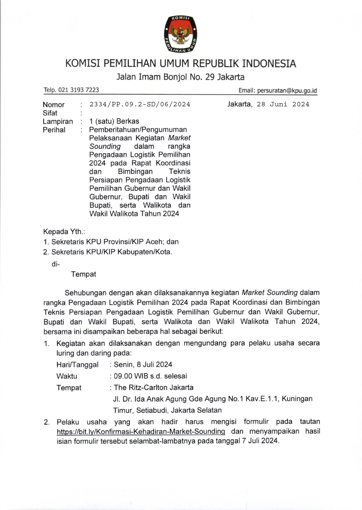 Pemberitahuan/Pengumuman Pelaksanaan Kegiatan Market Sounding dalam rangka Pengadaan Logistik Pemilihan 2024 pada Rapat Koordinasi dan Bimbingan Teknis Persiapan Pengadaan Logistik Pemilihan Gubernur dan Wakil Gubernur, Bupati dan Wakil Bupati, serta Walikota dan Wakil Walikota Tahun 2024.