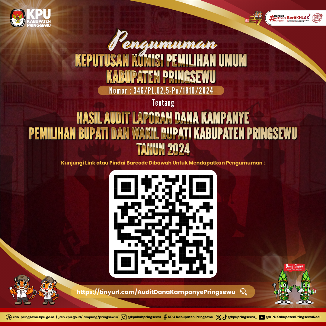 Berikut Pengumuman Keputusan Komisi Pemilihan Umum Kabupaten Pringsewu Nomor : 346/PL.02.5-Pu/1810/2024 tentang Hasil Audit Laporan Dana Kampanye Pemilihan Bupati dan Wakil Bupati Kabupaten Pringsewu Tahun 2024. Dapat di download di https://tinyurl.com/AuditDanaKampanyePringsewu