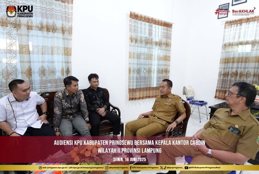 Senin, 16 Juni 2025, Komisi Pemilihan Umum (KPU) Kabupaten Pringsewu melaksanakan audiensi dengan Kepala Kantor Cabang Dinas Pendidikan Wilayah II Provinsi Lampung. Kegiatan ini bertujuan untuk membahas potensi kerja sama strategis dalam rangka peningkatan partisipasi pemilih, penguatan pendidikan politik, serta internalisasi nilai-nilai demokrasi di lingkungan satuan pendidikan. Audiensi berlangsung dengan penuh semangat kolaboratif, menandai komitmen bersama dalam membangun generasi muda yang sadar politik dan melek demokrasi.