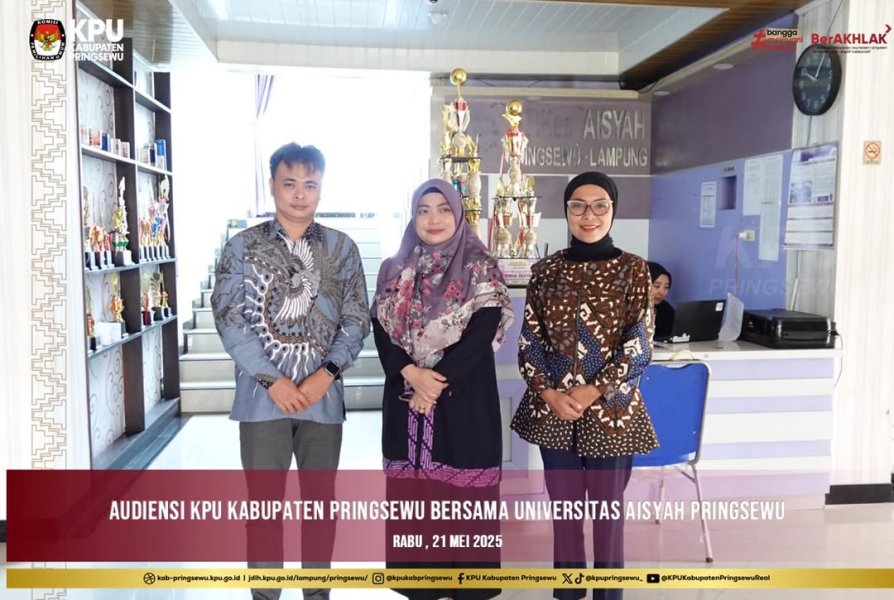 Rabu, 21 Mei 2025, Komisi Pemilihan Umum (KPU) Kabupaten Pringsewu melaksanakan audiensi dengan Universitas Aisyah Pringsewu (UAP). Audiensi ini bertujuan untuk membahas potensi kerja sama dalam bidang peningkatan partisipasi pemilih, pendidikan politik, serta penguatan nilai-nilai demokrasi di lingkungan kampus dan masyarakat luas. Kedua belah pihak menyambut baik kolaborasi ini sebagai langkah strategis dalam mendorong keterlibatan generasi muda dalam proses demokrasi dan pembangunan daerah. Kegiatan ini diharapkan menjadi awal dari sinergi antara lembaga penyelenggara pemilu dan institusi pendidikan tinggi dalam menciptakan pemilih yang cerdas, kritis, dan bertanggung jawab.