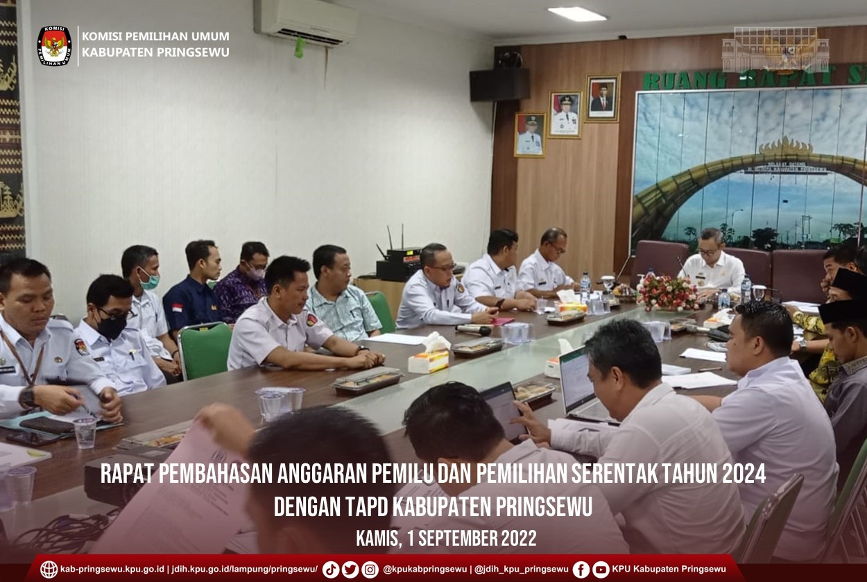 Komisi Pemilihan Umum Kabupaten Pringsewu rapat bersama dengan Tim Anggaran Pemerintah Daerah (TAPD) Kabupaten Pringsewu perihal membahas Perencanaan Penganggaran Pemilihan Kepala Daerah Tahun 2024 mendatang, Kamis (01/09/2022).