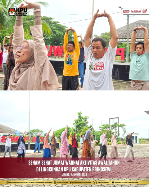 Tabik Puuun #TemanPemilih, Dalam rangka mengawali aktivitas kerja di tahun 2026, Komisi Pemilihan Umum (KPU) Kabupaten Pringsewu melaksanakan kegiatan Senam Sehat Jumat pada minggu pertama bulan Januari 2026. Kegiatan ini berlangsung di lingkungan Kantor KPU Kabupaten Pringsewu dan diikuti oleh seluruh jajaran sekretariat sebagai bentuk komitmen bersama dalam menjaga kesehatan dan kebugaran jasmani. Senam Sehat Jumat menjadi salah satu upaya KPU Kabupaten Pringsewu untuk menciptakan lingkungan kerja yang sehat, produktif, dan harmonis. Melalui kegiatan ini, diharapkan seluruh pegawai dapat menjaga stamina, meningkatkan semangat kerja, serta mempererat kebersamaan antarpegawai dalam suasana yang positif dan penuh kekeluargaan. Pelaksanaan senam sehat di awal tahun juga menjadi momentum untuk menumbuhkan semangat baru, disiplin, dan pola hidup sehat sebagai penunjang kinerja yang optimal. Dengan tubuh yang sehat dan pikiran yang segar, diharapkan seluruh jajaran KPU Kabupaten Pringsewu dapat melaksanakan tugas dan tanggung jawab kelembagaan secara profesional dan berintegritas. KPU Kabupaten Pringsewu berkomitmen untuk terus mendorong kegiatan-kegiatan positif yang mendukung keseimbangan antara kesehatan, kebersamaan, dan peningkatan kualitas pelayanan publik, sejalan dengan semangat kerja yang berkelanjutan di tahun 2026. @kpu_ri @kpu_lampung #KPUMelayani #KPUPringsewu #ASNBerAKHLAK