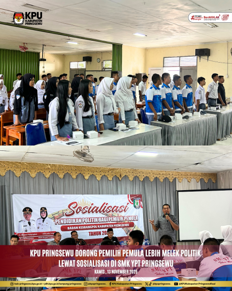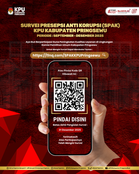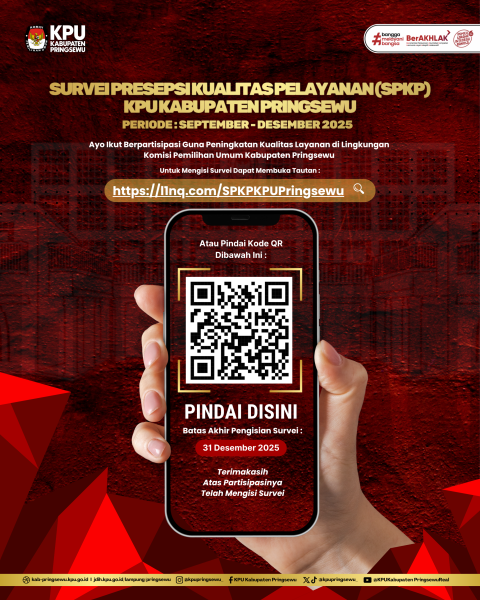Tabik Puuun #TemanPemilih, Dalam rangka mendukung upaya strategis percepatan Pelaksanaan Pembangunan dan Evaluasi Zona Integritas menuju Wilayah Bebas dari Korupsi dan Wilayah Birokrasi Bersih dan Melayani, KPU Kabupaten Pringsewu terus berkomitmen untuk mewujudkan tata kelola pemerintahan yang bersih, transparan, dan berintegritas tinggi. Sebagai wujud dari komitmen tersebut, KPU Kabupaten Pringsewu mengundang seluruh pengguna layanan dan masyarakat untuk berpartisipasi dalam Survei Persepsi Kualitas Pelayanan (SPKP) Periode September s.d Desember Tahun 2025. Survei ini bertujuan untuk mengukur tingkat kepuasan masyarakat terhadap layanan yang diberikan oleh KPU Kabupaten Pringsewu serta menjadi bahan evaluasi dan perbaikan pelayanan KPU Provinsi Lampung yang efektif, transparan, dan berorientasi pada kebutuhan masyarakat. Berikut kami sampaikan link sebagaimana dimaksud : Survei Persepsi Kualitas Pelayanan (SPKP)https://l1nq.com/SPKPKPUPringsewu Pengisian Survei dilaksanakan sampai dengan tanggal 31 Desember 2025. Demikian disampaikan dan terimakasih. @kpu_ri @kpu_lampung #KPUMelayani #KPUPringsewu #ASNBerAKHLAK