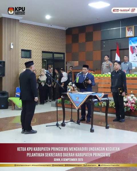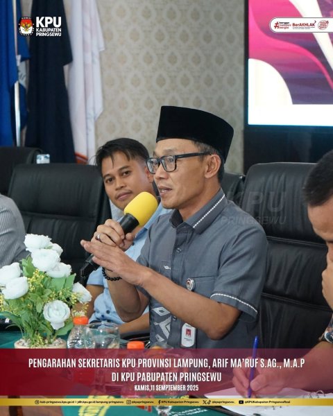 Kamis, 11 September 2025, KPU Kabupaten Pringsewu menerima kunjungan kerja sekaligus pengarahan dari Sekretaris KPU Provinsi Lampung, Bapak Arif Ma’ruf, S.Ag., M.A.P. Kegiatan ini merupakan bagian dari agenda koordinasi dan pembinaan kelembagaan yang secara rutin dilakukan oleh KPU Provinsi Lampung kepada jajaran KPU Kabupaten/Kota.