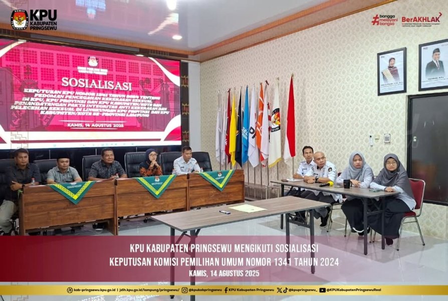 Ketua, Anggota, Sekretaris, serta para Kasubbag di lingkungan KPU Kabupaten Pringsewu turut berpartisipasi dalam kegiatan Sosialisasi Keputusan KPU Nomor 1341 Tahun 2024 tentang Pedoman Pencegahan Kekerasan Seksual di KPU, KPU Provinsi, dan KPU Kabupaten/Kota. Sosialisasi ini diselenggarakan dalam rangka meningkatkan pemahaman, kesadaran, serta komitmen seluruh jajaran KPU terhadap upaya pencegahan dan penanganan kekerasan maupun pelecehan seksual di lingkungan kerja.
