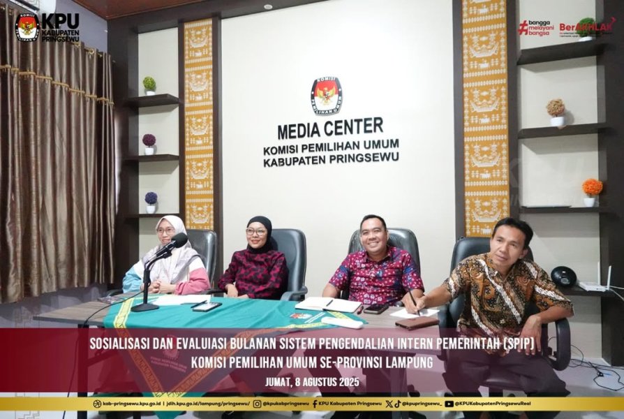 Jumat, 8 Agustus 2025 — KPU Kabupaten Pringsewu turut serta dalam kegiatan Sosialisasi dan Evaluasi Bulanan Sistem Pengendalian Intern Pemerintah (SPIP) yang diselenggarakan oleh KPU Provinsi Lampung.