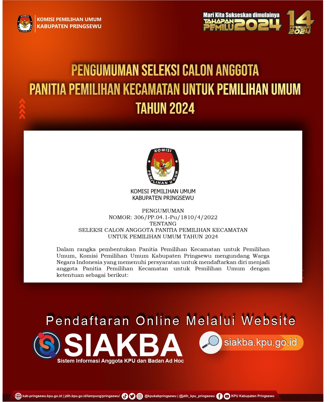 PENGUMUMAN NOMOR: 306/PP.04.1-Pu/1810/4/2022 TENTANG SELEKSI CALON ANGGOTA PANITIA PEMILIHAN KECAMATAN UNTUK PEMILIHAN UMUM TAHUN 2024 Dalam rangka pembentukan Panitia Pemilihan Kecamatan untuk Pemilihan Umum, Komisi Pemilihan Umum Kabupaten Pringsewu mengundang Warga Negara Indonesia yang memenuhi persyaratan untuk mendaftarkan diri menjadi anggota Panitia Pemilihan Kecamatan untuk Pemilihan Umum dengan ketentuan sebagai berikut: Persyaratan Anggota PPK: a. Warga Negara Indonesia; b. berusia paling rendah 17 (tujuh belas) tahun; c. setia kepada Pancasila sebagai dasar Negara, Undang-Undang Dasar Negara Republik Indonesia Tahun 1945, Negara Kesatuan Republik Indonesia, Bhinneka Tunggal Ika, dan cita-cita Proklamasi 17 Agustus 1945; d. mempunyai integritas, pribadi yang kuat, jujur dan adil; e. tidak menjadi anggota Partai Politik yang dinyatakan dengan surat pernyataan yang sah, atau sekurang-kurangnya 5 (lima) tahun tidak lagi menjadi anggota partai politik yang dibuktikan dengan surat keterangan dari pengurus partai politik yang bersangkutan; f. berdomisili dalam wilayah kerja PPK; g. mampu secara jasmani, rohani, dan bebas dari penyalahgunaan narkotika; h. berpendidikan paling rendah sekolah menengah atas atau sederajat; dan i. tidak pernah dipidana penjara berdasarkan putusan pengadilan yang telah memeroleh kekuatan hukum tetap karena melakukan tindak pidana yang diancam dengan pidana penjara 5 (lima) tahun atau lebih. Kelengkapan Dokumen Persyaratan: a. Surat pendaftaran sebagai calon anggota PPK; b. Fotokopi Kartu Tanda Penduduk Elektronik; c. Fotokopi ijazah sekolah menengah atas/sederajat atau ijazah terakhir; d. Surat pernyataan dalam satu dokumen yang menyatakan : 1. setia kepada Pancasila sebagai dasar Negara, Undang-Undang Dasar Negara Republik Indonesia Tahun 1945, Negara Kesatuan Republik Indonesia, Bhinneka Tunggal Ika, dan cita-cita Proklamasi 17 Agustus 1945; 2. tidak menjadi anggota Partai Politik; 3. bebas dari penyalahgunaan narkotika; 4. tidak pernah dipidana penjara berdasarkan putusan pengadilan yang telah memeroleh kekuatan hukum tetap karena melakukan tindak pidana yang diancam dengan pidana penjara 5 (lima) tahun atau lebih; 5. tidak pernah dijatuhi sanksi pemberhentian tetap oleh KPU Kabupaten/Kota atau Dewan Kehormatan Penyelenggara Pemilu; 6. tidak menjadi tim kampanye atau tim pemenangan atau saksi peserta Pemilu atau Pemilihan pada penyelenggaraan Pemilu dan Pemilihan paling singkat dalam 5 (lima) tahun terakhir; 7. tidak berada dalam ikatan perkawinan dengan sesama penyelenggara Pemilu; 8. tidak memiliki penyakit penyerta (komorbiditas); 9. mempunyai kemampuan dan kecakapan dalam membaca, menulis dan berhitung; dan 10. mampu mengoperasikan perangkat teknologi informasi. e. Surat keterangan dari partai politik yang bersangkutan bagi calon yang paling singkat 5 (lima) tahun tidak lagi menjadi anggota Partai Politik; f. Surat keterangan sehat jasmani dan rohani yang dikeluarkan oleh puskesmas, rumah sakit, atau klinik yang termasuk di dalamnya terdapat pemeriksaan tekanan darah, kadar gula darah, dan kolesterol; g. Daftar Riwayat Hidup; h. Pas Foto Berwarna 4x6; dan Surat Pendaftaran dan kelengkapan dokumen disampaikan kepada KPU Kabupaten Pringsewu sejak tanggal 20 November 2022 sampai dengan tanggal 29 November 2022 Pukul 16.00 WIB, melalui: a. siakba.kpu.go.id dan dokumen fisik yang disampaikan pada saat sebelum pelaksanaan seleksi tertulis; atau b. Petugas Pendaftaran di Kantor Sekretariat KPU Kabupaten Pringsewu Alamat : Komplek Pemerintahan Daerah Kabupaten Pringsewu Kontak : Helpdesk KPU Kabupaten Pringsewu Sdr.Asrianturi, 085381129333 Waktu : 08.00 – 16.00 WIB Demikian pengumuman ini disampaikan, untuk diketahui. Persyaratan dan Formasi Kebutuhan dapat dilihat melalui link berikut : PENGUMUMAN SELEKSI PANITIA PEMILIHAN KECAMATAN UNTUK PEMILU TAHUN 2024