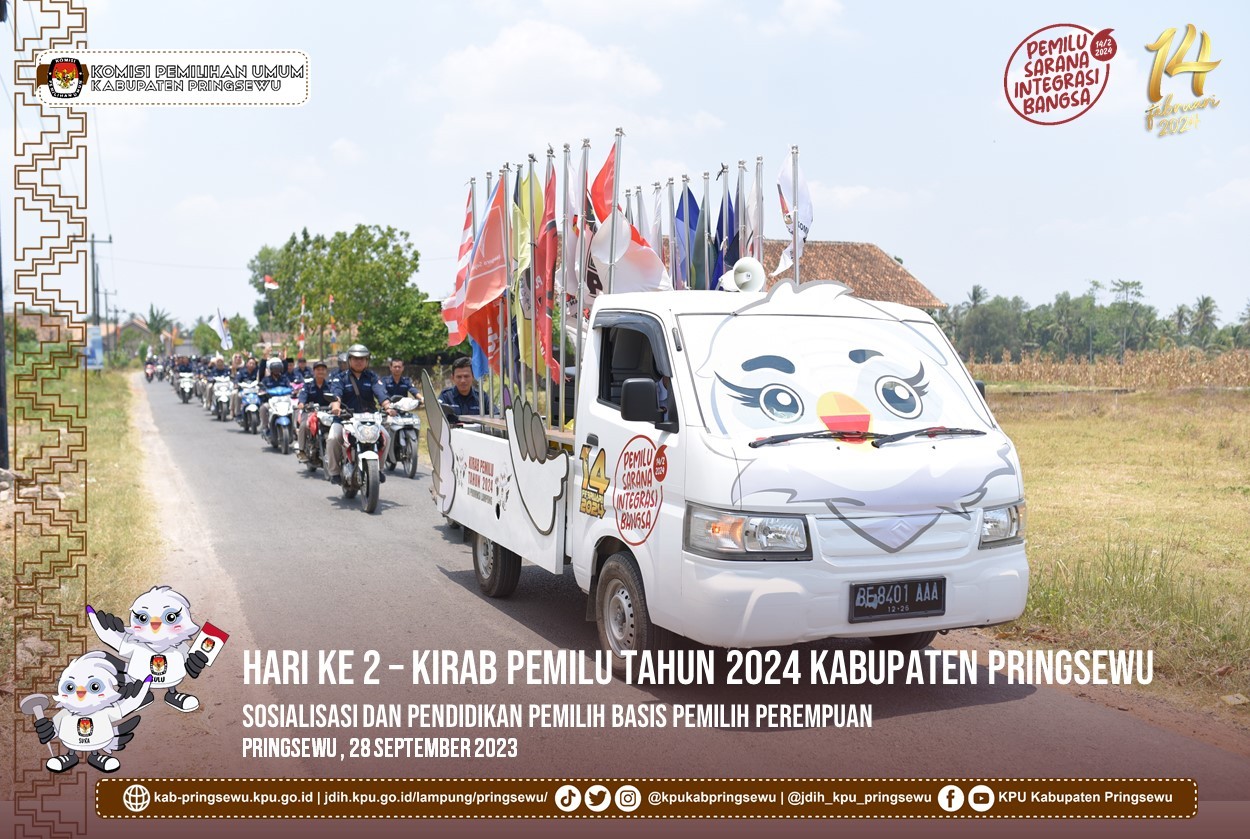 #TemanPemilih, Kegiatan Sosialisasi pada Pemilih Basis Pemilih Perempuan ( Kelompok ibu-ibu Pengajian Majlis Ta'lim Pekon Pamenang Kec. Pagelaran dan Sekitarnya) pada pukul 09.00 di Lokasi Wisata Lanakila Lake. Acara Diawali dengan menyanyikan lagu kebangsaan dan jingle pemilu, kemudian acara dibuka oleh Bpk Sofyan Akbar Budiman selaku Ketua KPU Kabupaten Pringsewu, dan DiLanjutkan Kegiatan Sosialisasi dan Pendidikan pemilih oleh Ketua Divisi Sosdiklih Parmas dan SDM KPU Kabupaten Pringsewu Ibu Dewi Eliyasari. Dalam sosialisasi tersebut dijelaskan apa syarat memilih dan tanggal pemilihan umum akan dilaksanakan kemudian dilakukan sesi tanya jawab dan pembagian doorprize kepada tamu undangan yang dapat menjawab pertanyaan-pertanyaan yang diajukan. Acara Dilanjut Kegiatan Pengajian Maulid Nabi Kirab Pemilu Tahun 2024 Kabupaten Pringsewu, dalam Sosialisasi dan Pendididkan Pemilih Basis Pemilih Perempuan ( Kelompok ibu-ibu Pengajian Majlis Ta'lim Pekon Pamenang Kec. Pagelaran dan Sekitarnya) sebanyak : ± 350 Peserta. Terdiri dari Seluruh Badan Adhoc Kecamatan Pagelaran dan Kecamatan Pagelaran Utara K. Pringsewu, Serta Majlis Ta'lim Pekon Pamenang dan Sekitarnya. Turut hadir juga dalam acara tersebut Sekretaris dan Staf Sekretariat KPU Pringsewu. Kegiatan Kirab Pemilu 2024 diikuti oleh Seluruh Badan Adhoc Kecamatan Pagelaran dan Kecamatan Pagelaran Utara yang berjumlah ±250 peserta. Adapun rute pawai yang dilalui yaitu dari Lanakila Lake melewati Desa Pamenang, Lugusari , dan Sukawangi, Sukaratu dan Berakhir di Pasar Pagelaran Kec.Pagelaran. Diperjalanan pawai tak henti mensosialisasikan tahapan kepemiluan. Masyarakat sekitar sangat antusias melihat rombongan Kirab Pemilu melewati lingkunga pekon mereka sembari mensosialisasikan tahapan kepemiluan. #KPUMelayani #KPUPringsewu #PemiluSerentak2024