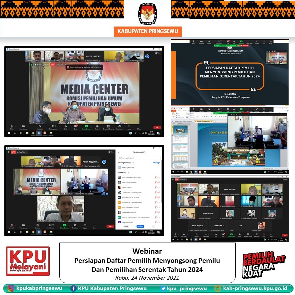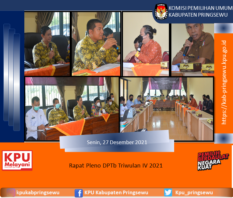 Pringsewu – Selasa, 7 Desember 2021 Komisi Pemilihan Umum (KPU) Kabupaten Pringsewu mengikuti Rapat Rekapitulasi Pemutakhiran Daftar Pemilih Berkelanjutan (DPB) Periode Bulan November Tingkat Provinsi Lampung Tahun 2021 yang diadakan secara daring (zoom meeting) yang dilaksanakan oleh KPU Provinsi Lampung. Rapat dihadiri oleh Ketua dan Anggota KPU Provinsi Lampung serta diikuti oleh Ketua beserta Anggota KPU, dan Admin/Operator Sidalih dari 15 Kabupaten/Kota se-Provinsi Lampung. Adapun hasil Rapat adalah sebagai berikut: Jumlah pemilih sebanyak 5.978.467 (Lima Juta Sembilan Ratus Tujuh Puluh Delapan Ribu Empat Ratus Enam Puluh Tujuh) orang, tersebar di 2.640 desa/kelurahan dari 229 (Dua Ratus Dua Puluh Sembilan) Kecamatan di 15 kabupaten/kota se-Provinsi Lampung; Jumlah pemilih Tidak Memenuhi Syarat (TMS) sebanyak 5.620 (Lima Ribu Enam Ratus Dua Puluh) orang, terdiri pemilih TMS meninggal sebanyak 2.264 (Dua Ribu Dua Ratus Enam Puluh Empat) orang, pemilih TMS ganda sebanyak 808 (Delapan Ratus Delapan) orang, pemilih pindah sebanyak 2.526 (Dua Ribu Lima Ratus Dua Puluh Enam) orang, dan pemilih TMS bukan penduduk sebanyak 22 (Dua Puluh Dua) orang. Jumlah pemilih pindah keluar sebanyak 622 (Enam Ratus Dua Puluh Dua) orang. Jumlah potensi pemilih baru sebanyak 2.870 (Dua Ribu Delapan Ratus Tujuh Puluh) orang.